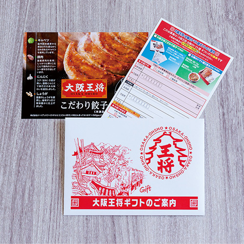 具材はすべて国産品。大阪王将の看板商品とも言えるこだわりの餃子か、イタリア産完熟有機トマトが約3個入ったリコピンたっぷりのおいしいスープが味わえる太陽のトマト麺のどちらかを選べるうれしいギフトカードです。