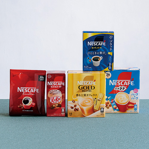 "好きなときに、好きな美味しさを味わえる"「ネスカフェ」シリーズ。深いコクが楽しめる「ネスカフェエクセラ」や、スティックタイプのカフェラテ、コーヒーのコクとチョコレートのまろやかな甘さとウエハースの香ばしさが口に広がる「キットカットラテ」などをセットで。