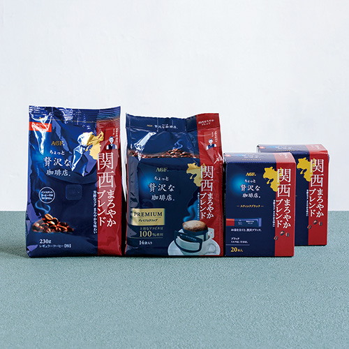 「ちょっと贅沢な珈琲店®」シリーズから関西エリアで好まれる優しい苦味とやわらかな酸味にこだわったコーヒーを。レギュラーコーヒー(粉)やドリップコーヒー、手軽に楽しめるスティックタイプなど、シーンに合わせて味わってください。