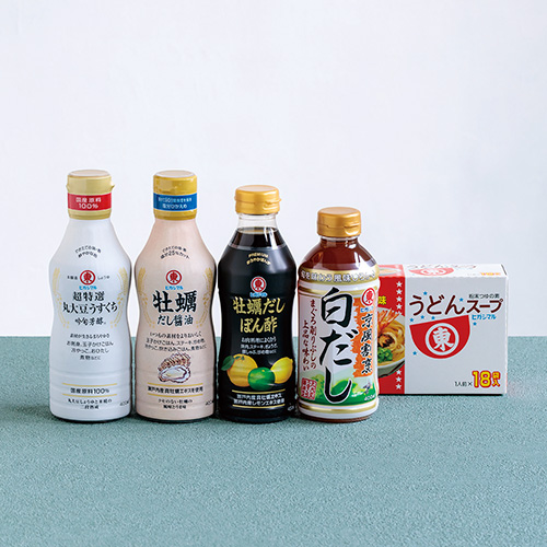 芳香な香り、美しい色合いと旨みのうす口しょうゆ、塩分控えめで瀬戸内産真がきエキスの旨みとかつおと昆布のだしを合わせた
