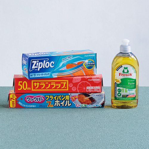 台所には欠かせない、ジップロックやサランラップ、つるつるで油なしでもくっつかないので魚を焼くときにも便利なフライパン用ホイルや、手肌に優しく、環境にも配慮されたドイツ生まれの柚子の香りの食器用洗剤「フロッシュ®」をセットで。